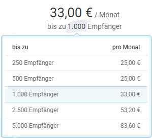 Au cours du mois, vos contacts se multiplient et dépassent la limite de votre niveau tarifaire actuel. Ne vous inquiétez pas, cela ne signifie pas que vous ne pouvez pas contacter vos nouveaux contacts par newsletter. Au contraire, nous vous informerons avant l'envoi de votre mailing que votre nombre de destinataires est désormais plus élevé et si vous acceptez l'adaptation à un niveau tarifaire supérieur. Une fois l'accord donné, vous pouvez procéder à l'envoi comme prévu.