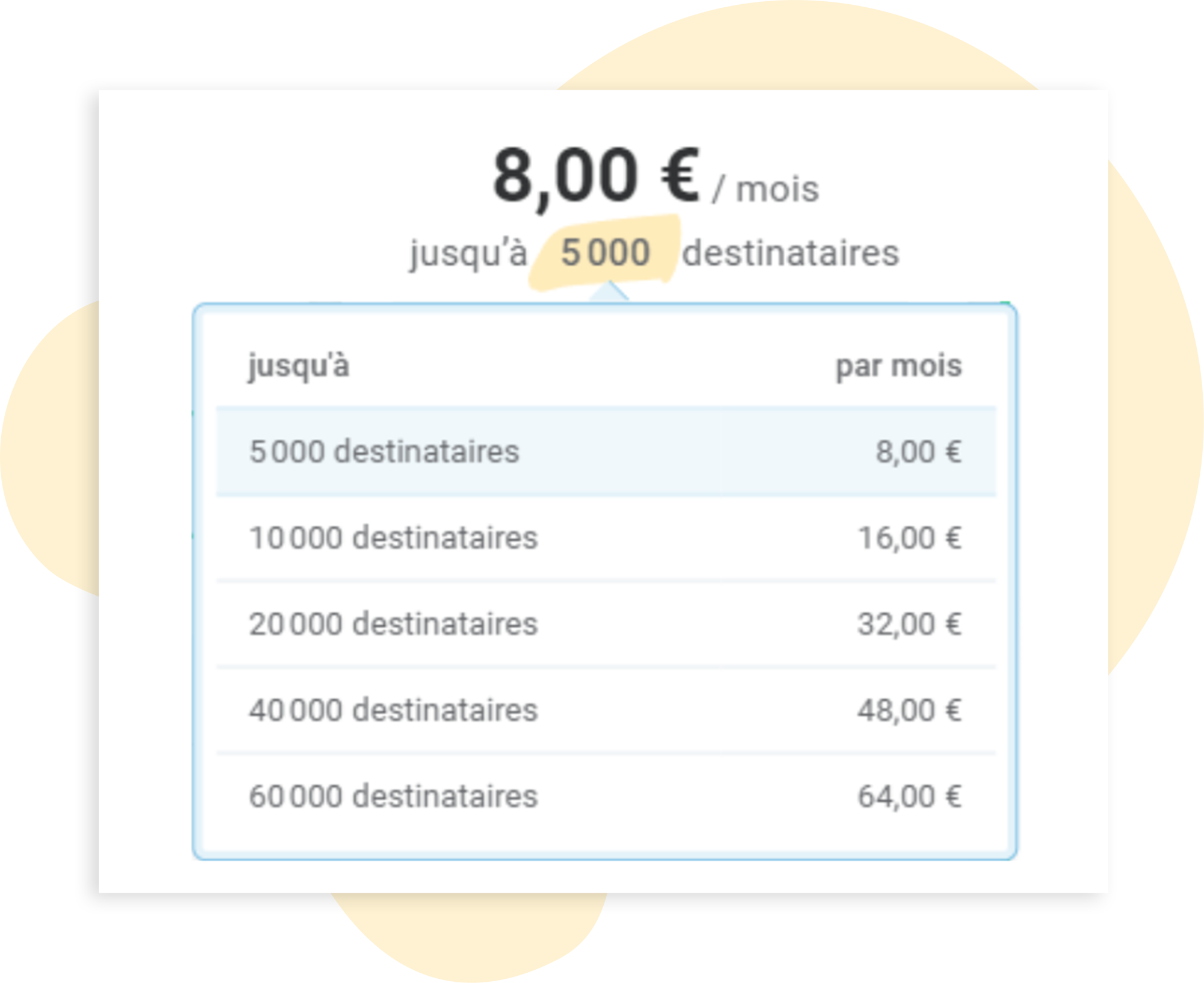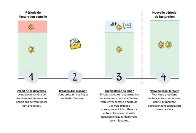 Si votre nombre de contacts augmente et dépasse le palier tarifaire inclus dans votre abonnement, pas d'inquiétude ! Vous serez informé avant l'envoi de votre mailing, et vous pourrez confirmer l'adaptation au tarif supérieur que votre nombre de destinataires est désormais plus élevé. Une fois confirmé, vous pouvez envoyer vos newsletters sans interruption.