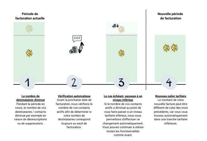 Si des contacts se désinscrivent ou que vous réduisez le nombre de contacts dans votre liste en supprimant certains contacts, vous passerez automatiquement à un tarif inférieur pour la prochaine période de facturation, ce qui réduira le montant de votre facture.
