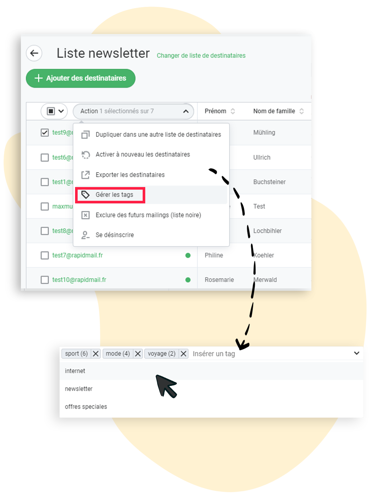 Procédez à l'import de votre fichier contenant les destinataires et leurs tags en suivant ces étapes :
