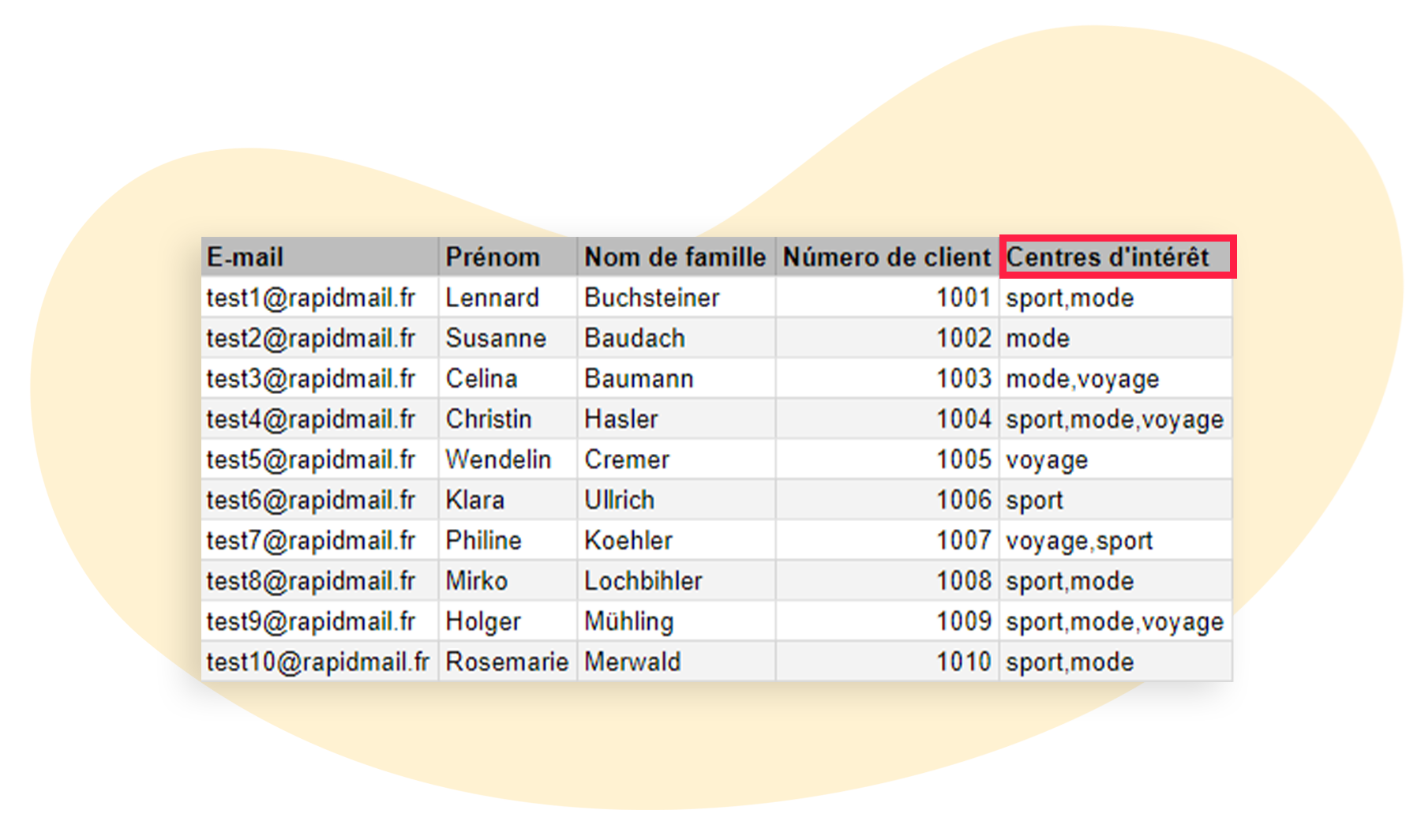 ❗À noter : Si un destinataire a plusieurs mots-clés, ils doivent être séparés par des virgules ou des points-virgules, comme illustré dans la colonne Centre d'intérêt.