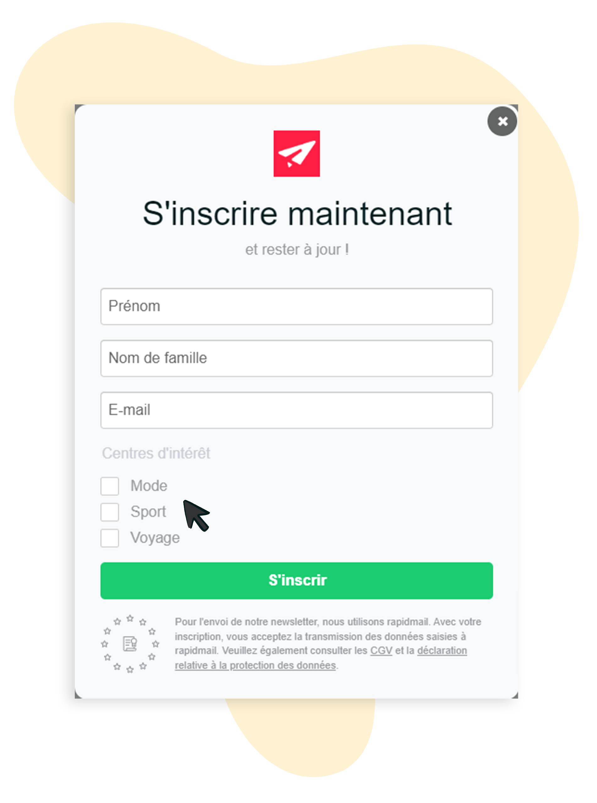 Pour mieux connaître les centres d'intérêt de vos destinataires et leur permettre de recevoir des contenus adaptés, vous pouvez inclure une demande de mots-clés dans le formulaire dès l'inscription à la newsletter. Les destinataires auront également la possibilité de modifier ou d'élargir leurs centres d'intérêt ultérieurement.