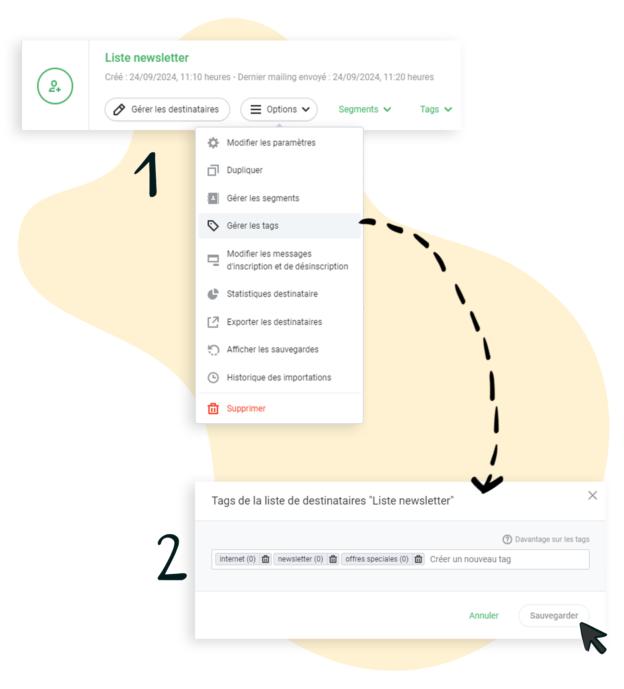 Ouvrez la liste de destinataires concernée dans rapidmail. Cliquez sur Options > Gérer les tags. Saisissez ensuite les mots-clés collectés précédemment. Après chaque saisie, appuyez sur la touche ↵ Entrée pour valider un mot-clé avant de passer au suivant. Une fois tous les mots-clés ajoutés, cliquez sur Enregistrer.