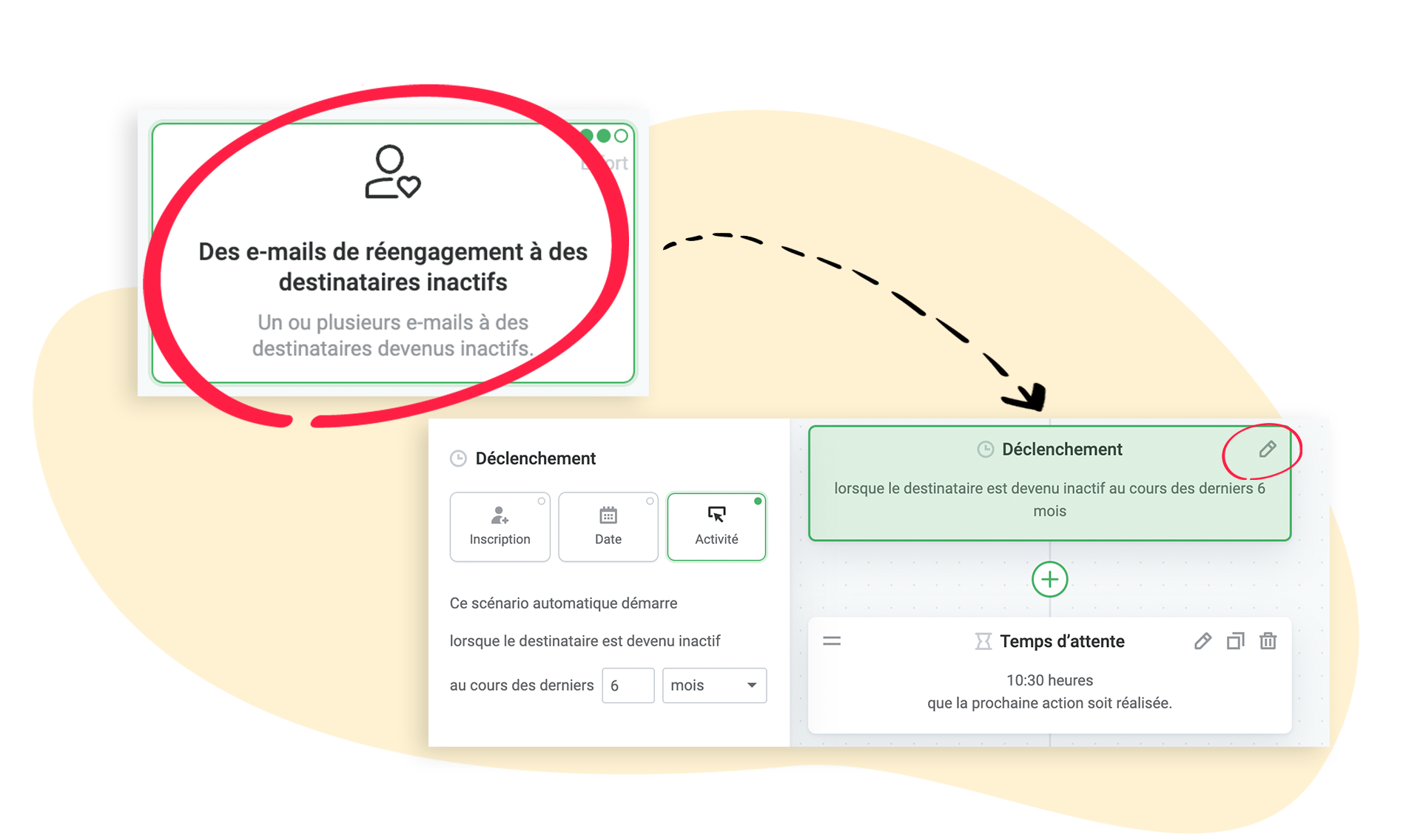 Le déclencheur de cette automatisation est le comportement des destinataires : les destinataires qui ont été inactifs au cours des 6 derniers mois sont la cible de ces mailings. Vous pouvez modifier la durée à votre discrétion.