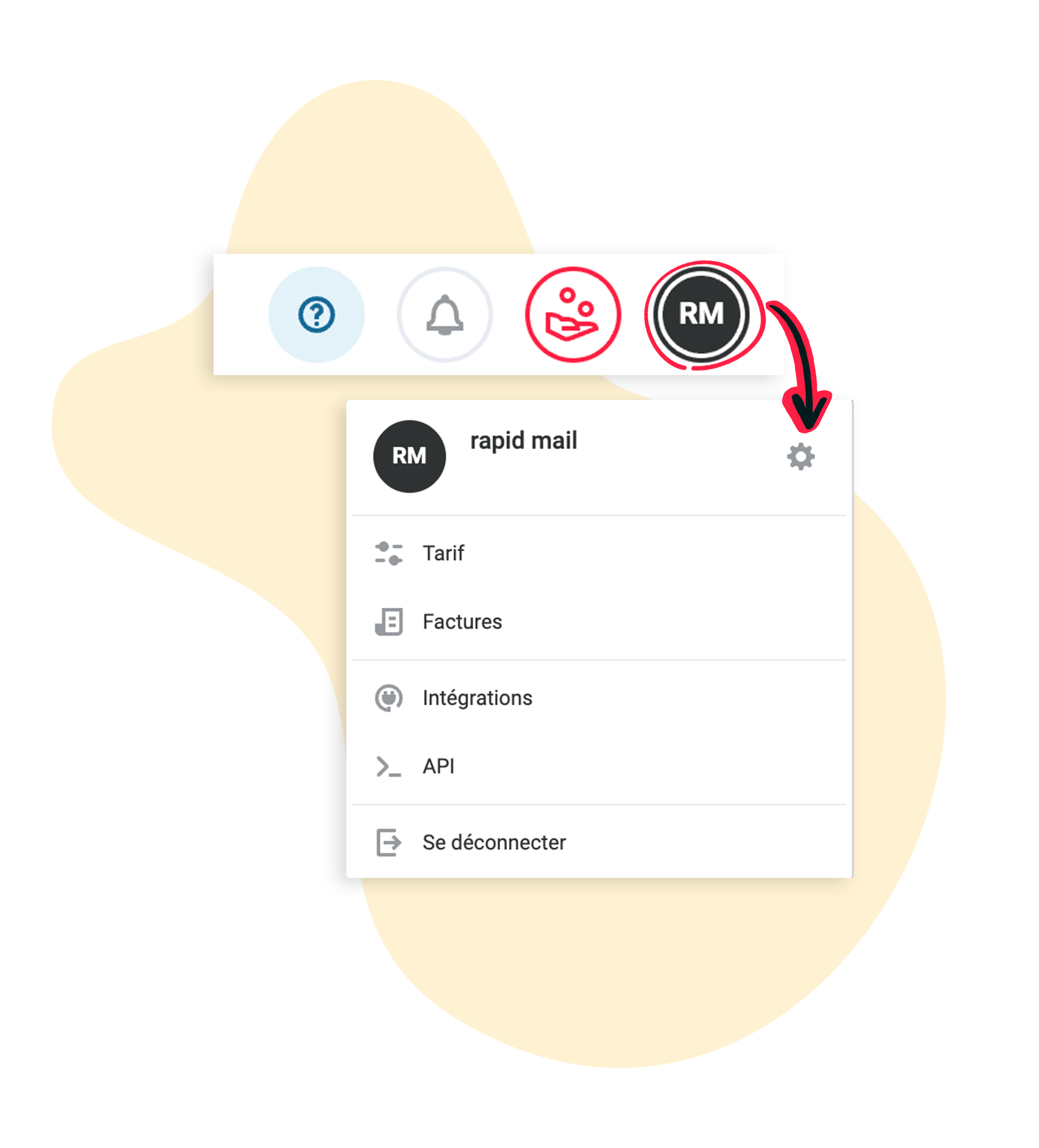 Connectez-vous à votre compte rapidmail et cliquez en haut à droite sur vos initiales, puis sur l'icône d'engrenage pour accéder aux paramètres du compte.