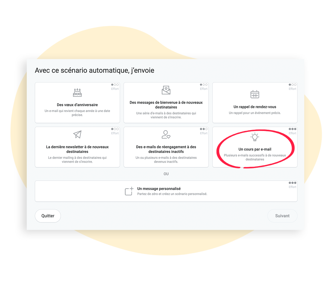 Ce workflow est conçu pour l'envoi de cours par e-mail : vous pouvez, par exemple, préparer des leçons individuelles d'une série ou d'un webinaire dans des mailings distincts et les envoyer à des intervalles de temps. Pour cela, vous devez créer votre série de mailings une seule fois : l'envoi se fait automatiquement ! Pour vos contacts de newsletter, c'est pratique, car ils n'ont pas besoin de s'inscrire à un cours à un moment fixe, mais peuvent commencer à tout moment. Nous vous montrons comment cela fonctionne.