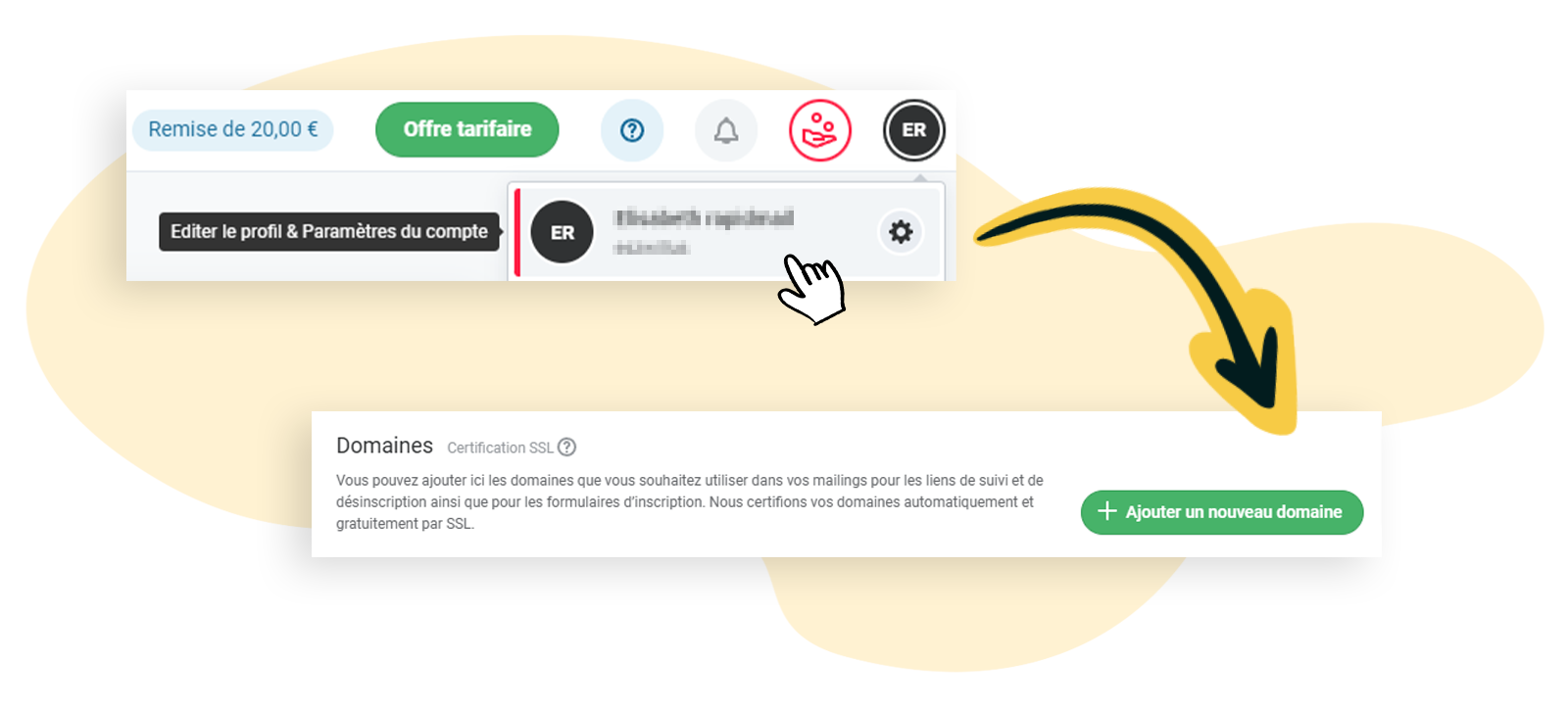 Une fois que l’enregistrement CNAME a été configuré dans les paramètres DNS de votre serveur, vous pouvez ajouter le nouveau domaine à votre compte rapidmail. Accédez aux paramètres de votre compte et sélectionnez Domains > ➕ Ajouter un nouveau domaine.