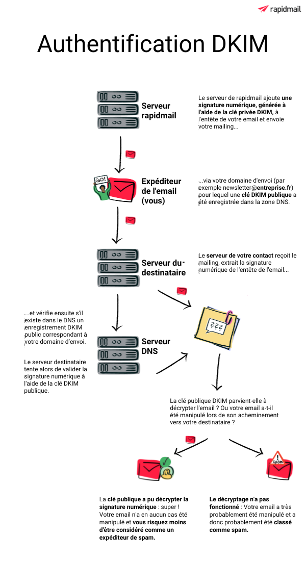 Pour ce faire, deux clés numériques interconnectées sont générées. L’une des clés, appelée clé publique, est enregistrée dans le DNS de votre domaine d’expéditeur (par exemple, newsletter@monentreprise.fr) chez votre hébergeur web et est accessible publiquement. L’autre clé, appelée clé privée, est stockée sur le serveur de l’expéditeur (dans ce cas, le serveur de rapidmail) et conservée en toute sécurité. Elle n’est pas accessible publiquement.