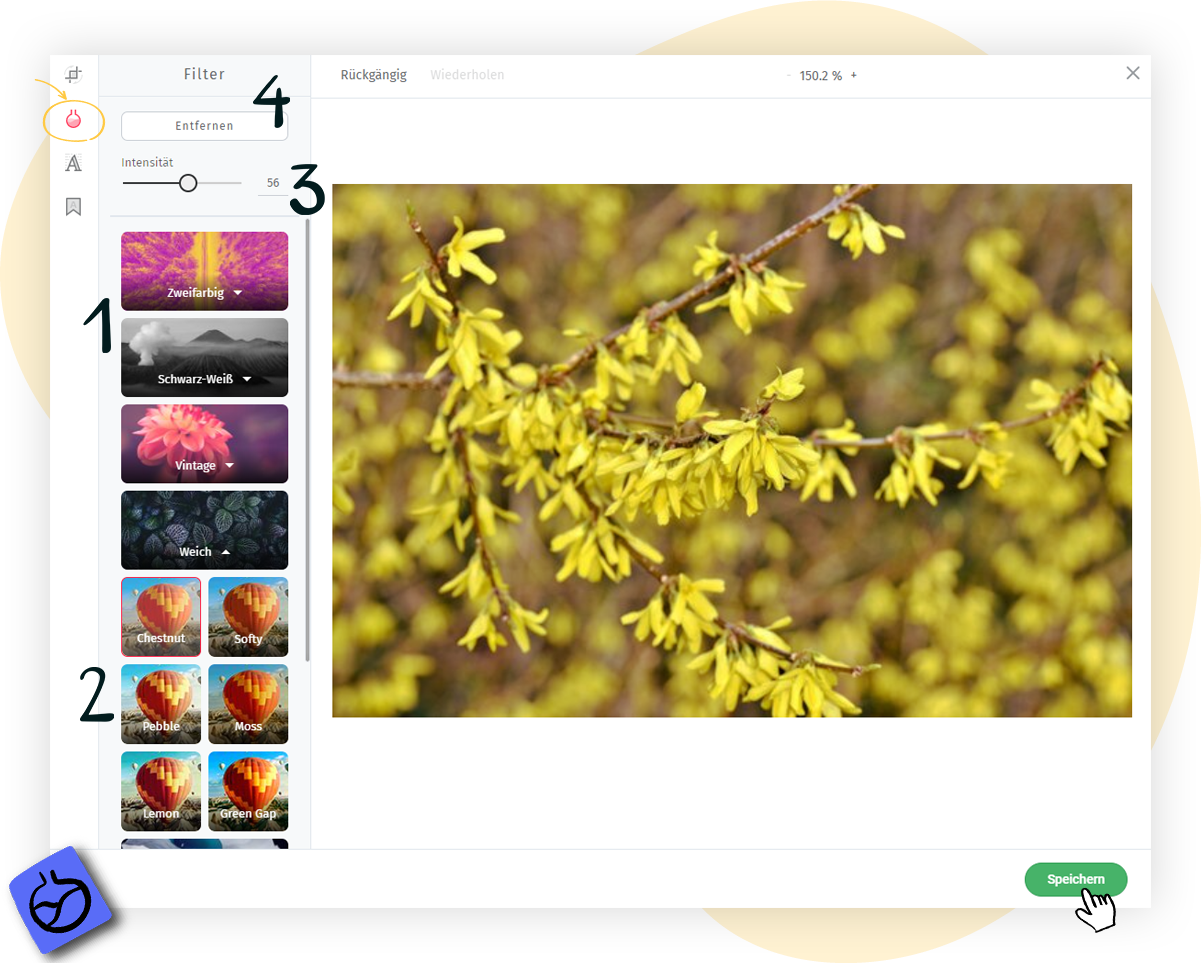 Vous pouvez utiliser plus de 60 filtres dans l'éditeur d'images. Vous pouvez les appliquer à vos fichiers image. Pour accéder aux filtres, cliquez sur le deuxième symbole dans la barre latérale gauche :