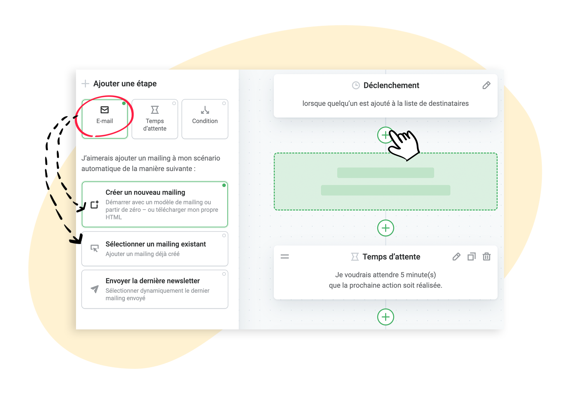 Vous avez la possibilité d’envoyer un seul mailing de bienvenue ou d’intégrer plusieurs e-mails dans votre scénario d’automatisation. Vous pouvez également définir un déclencheur temporel afin de décider si vos contacts doivent recevoir le message immédiatement ou avec un certain délai.