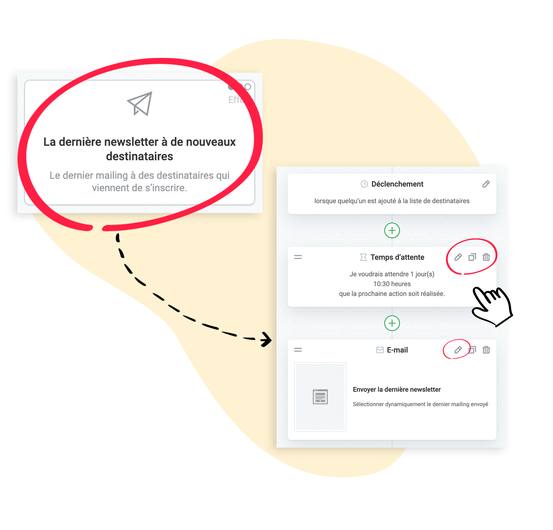 Vous souhaitez envoyer votre dernière newsletter à des contacts qui ont été ajoutés à votre liste de destinataires après l'envoi, afin de combler l'attente jusqu'à la prochaine ? Cette automatisation vous aide à envoyer votre dernière newsletter aux nouveaux contacts pour qu'ils ne manquent pas les dernières nouvelles. La newsletter est toujours sélectionnée dynamiquement, ce qui signifie que la dernière envoyée est choisie automatiquement.