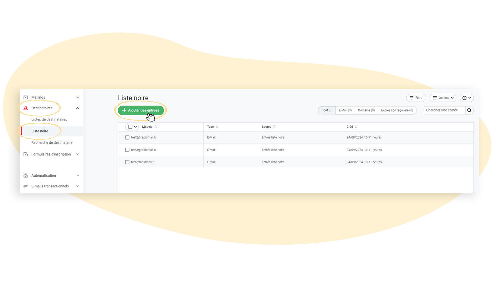 Vous pouvez également ajouter manuellement les contacts souhaités à la liste noire. Pour ce faire, rendez-vous dans Destinataires > Liste noire et cliquez sur le bouton ➕ Ajouter des entrées.