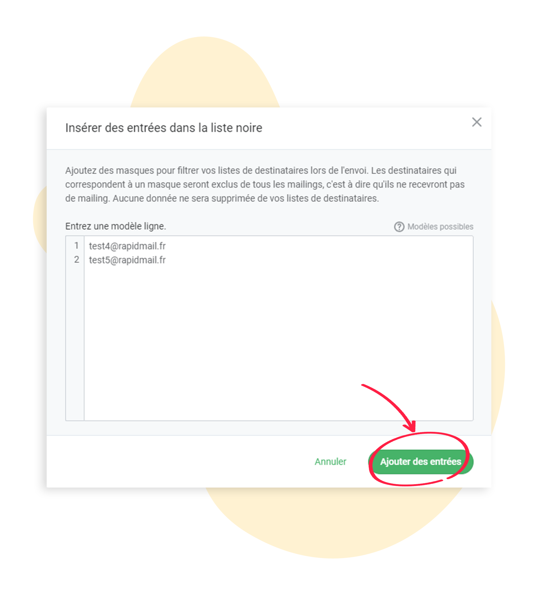 Dans la fenêtre qui s'ouvre, saisissez les adresses email des contacts à exclure de la newsletter. Appuyez sur la touche Entrée ↵ de votre clavier pour valider chaque adresse et passer à la ligne suivante. Une fois toutes les adresses saisies, confirmez l’opération en cliquant sur le bouton Ajouter des entrées.