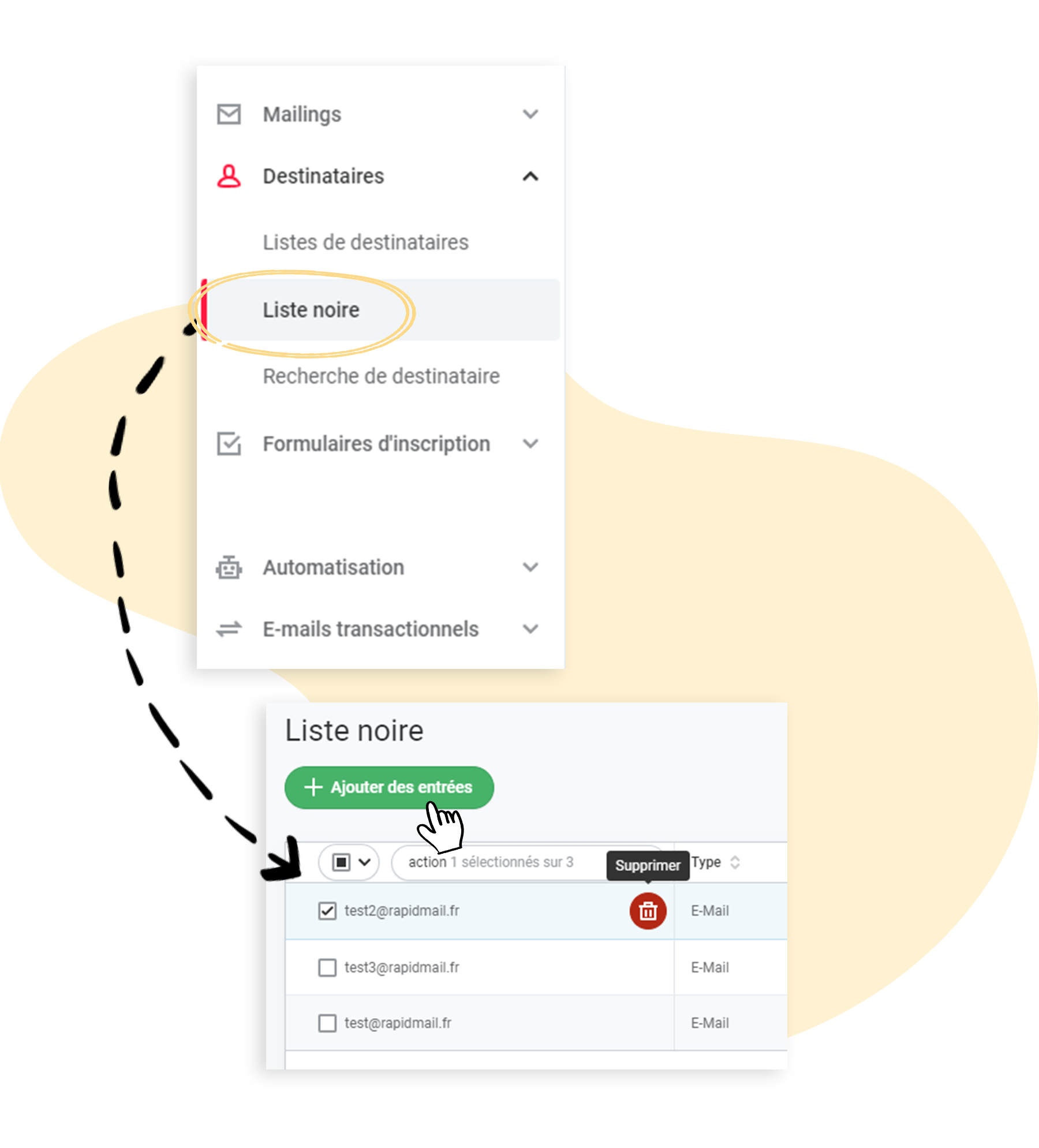 Pour cela, allez dans Destinataires > Liste noire. Cochez les adresses email que vous souhaitez réactiver en les sélectionnant individuellement. Ensuite, cliquez sur Action > Supprimer pour les retirer de la liste noire.
