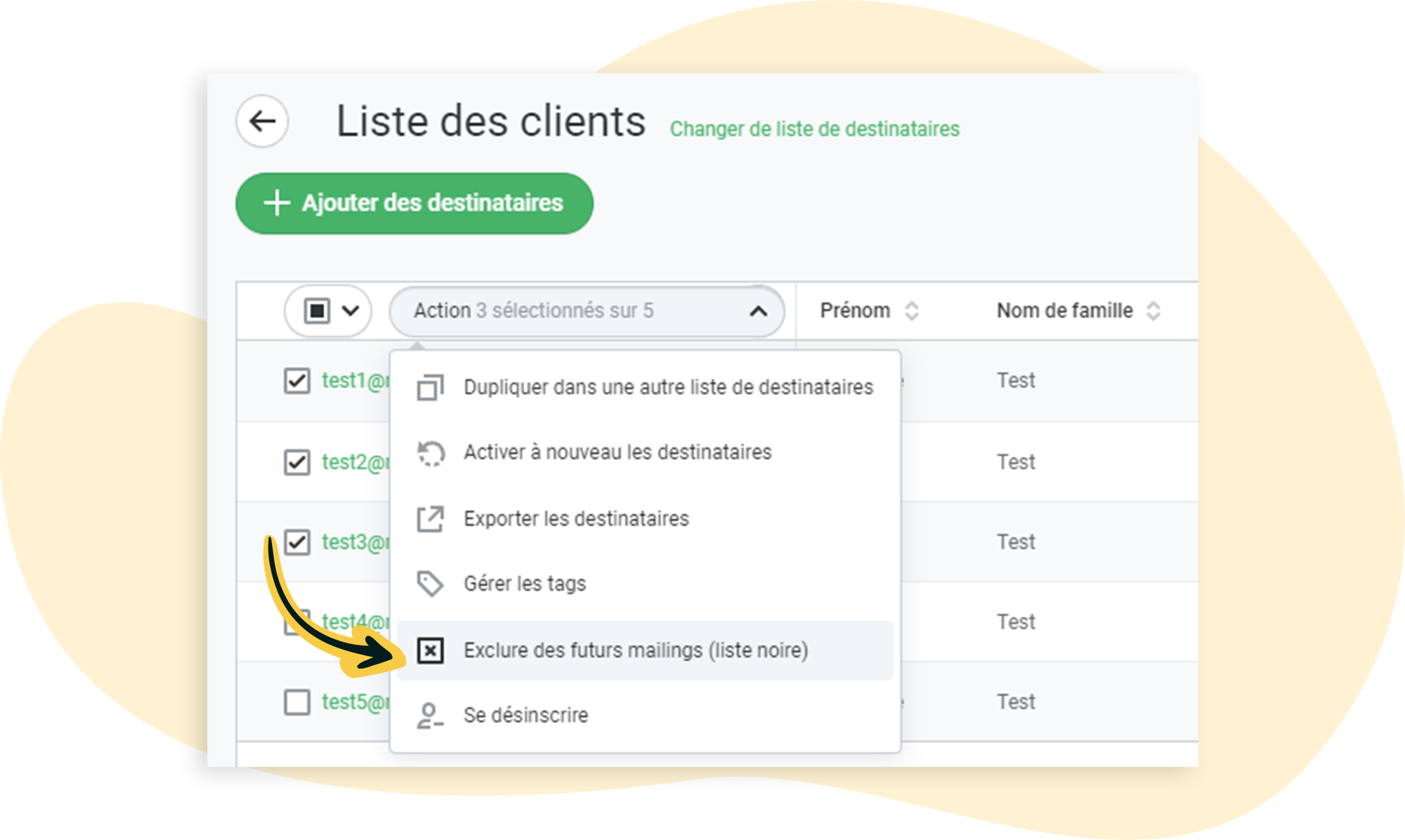 En cliquant sur Action en haut de la liste des destinataires, un menu déroulant s'ouvre. Vous y trouverez l'option Exclure des futurs mailings (liste noire). Cliquez sur cette option, puis confirmez l'opération.