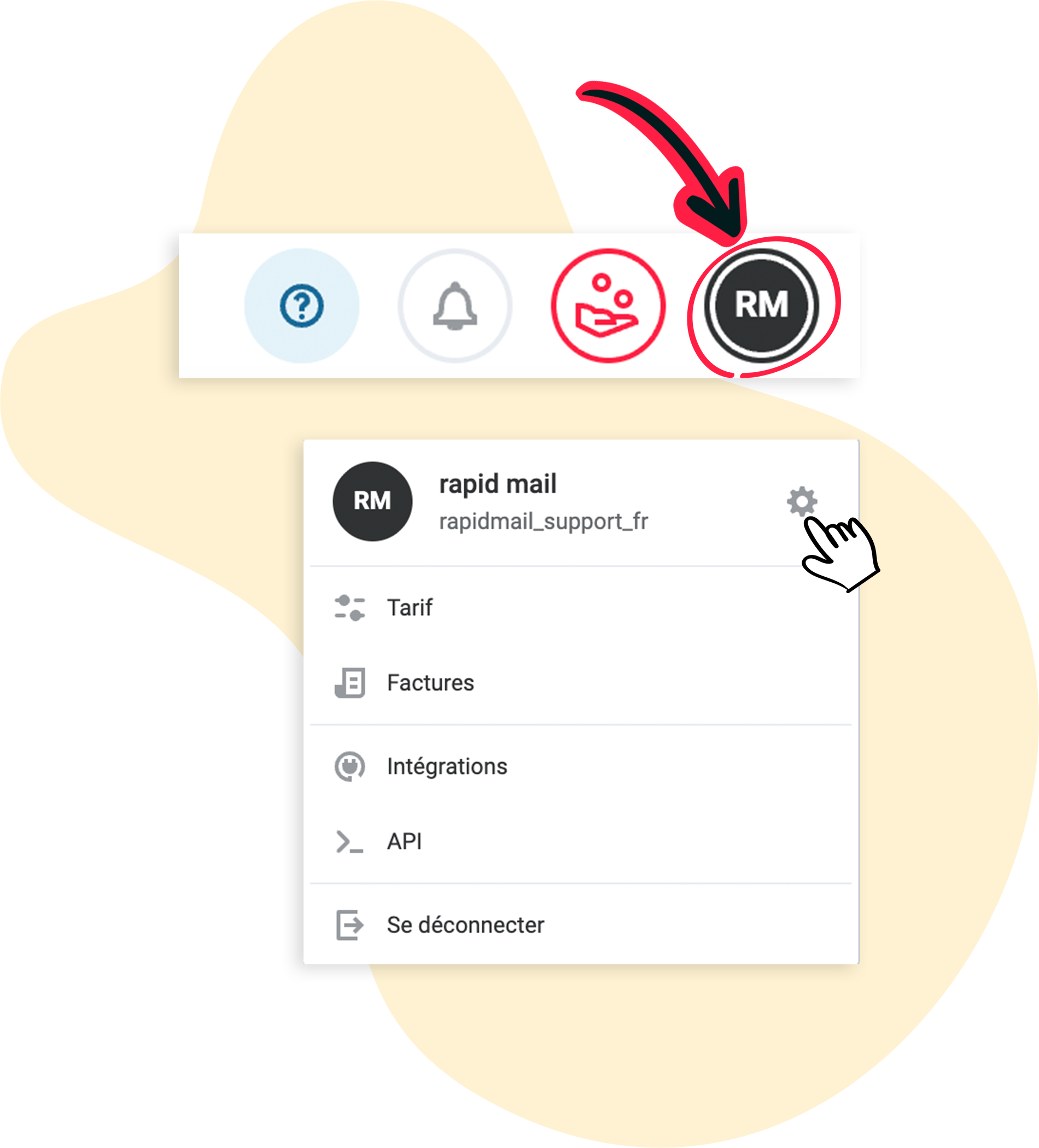 Connectez-vous à votre compte rapidmail, cliquez sur votre initiale en haut à droite, puis sélectionnez l’icône en forme de roue dentée pour ouvrir les paramètres de votre compte.