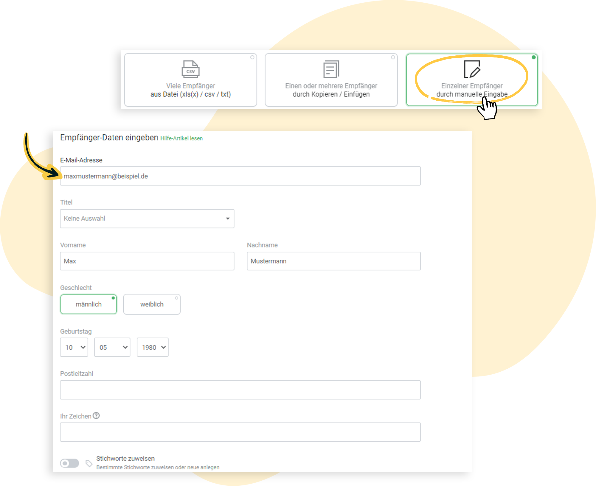 L'une des trois possibilités qui s'offrent à vous pour importer des destinataires dans rapidmail consiste à saisir manuellement les données de contact correspondantes. Dans cet article, nous vous expliquons en détail chaque étape du processus, en mettant en avant les points auxquels il faut particulièrement prêter attention.