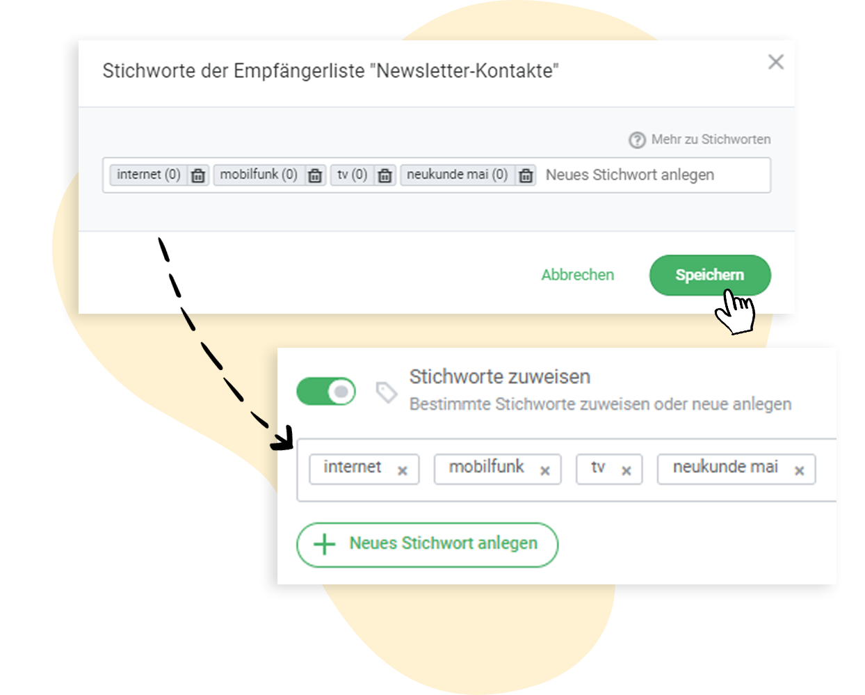 En option, vous avez la possibilité d'attribuer un ou plusieurs tags au destinataire. Pour ce faire, activez dans la partie inférieure le point "Attribuer des mots-clés" et choisissez parmi les tags que vous avez déjà créés ou créez un nouveau tag.