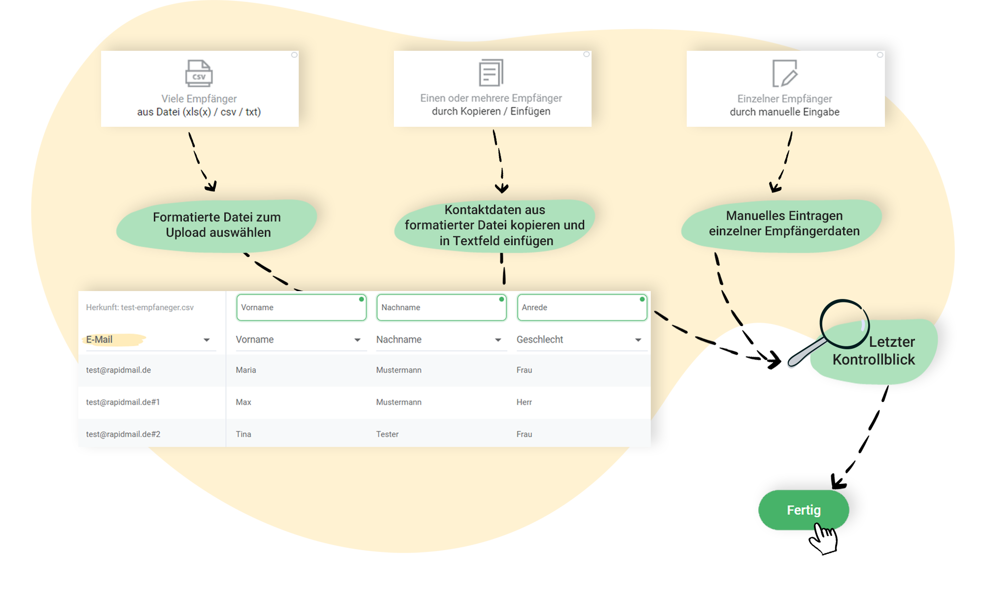 Lorsque vous créez une liste de destinataires dans rapidmail, celle-ci est d'abord vide. Il faut maintenant importer des destinataires, c'est-à-dire ajouter des contacts à votre liste de destinataires. Dans cet article, nous vous présentons les trois options qui vous permettent d'importer vos contacts dans rapidmail. Vous trouverez également les liens correspondants pour les instructions détaillées sur chaque option d'import de destinataires.