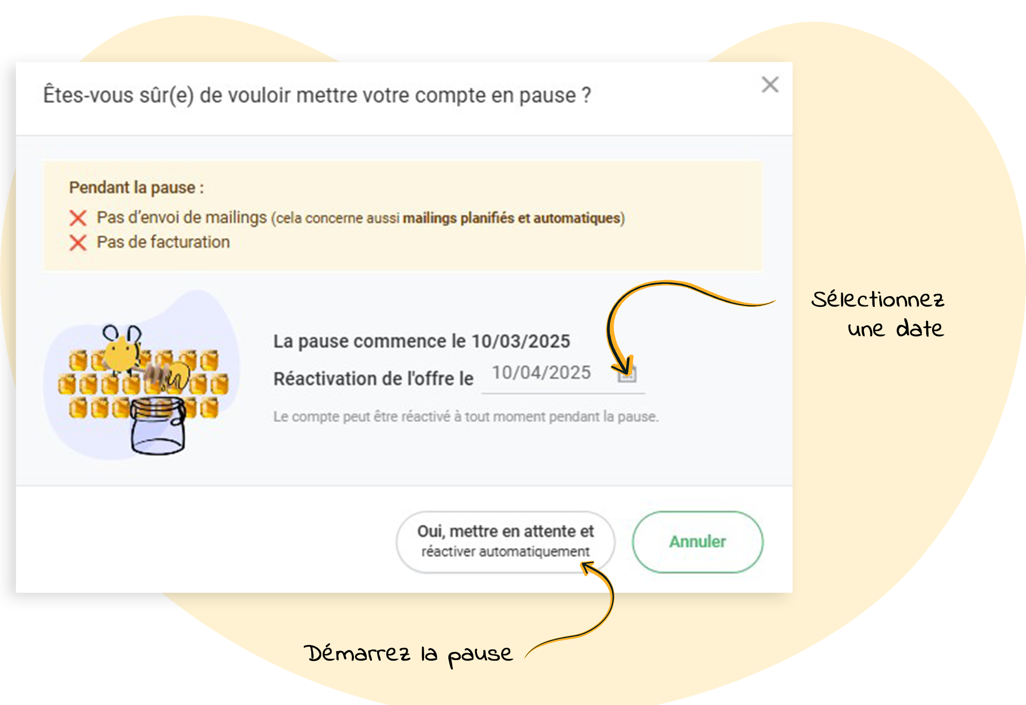 Important : pendant une pause, aucun mailing ne sera envoyé, y compris les mailings planifiés ou automatiques.