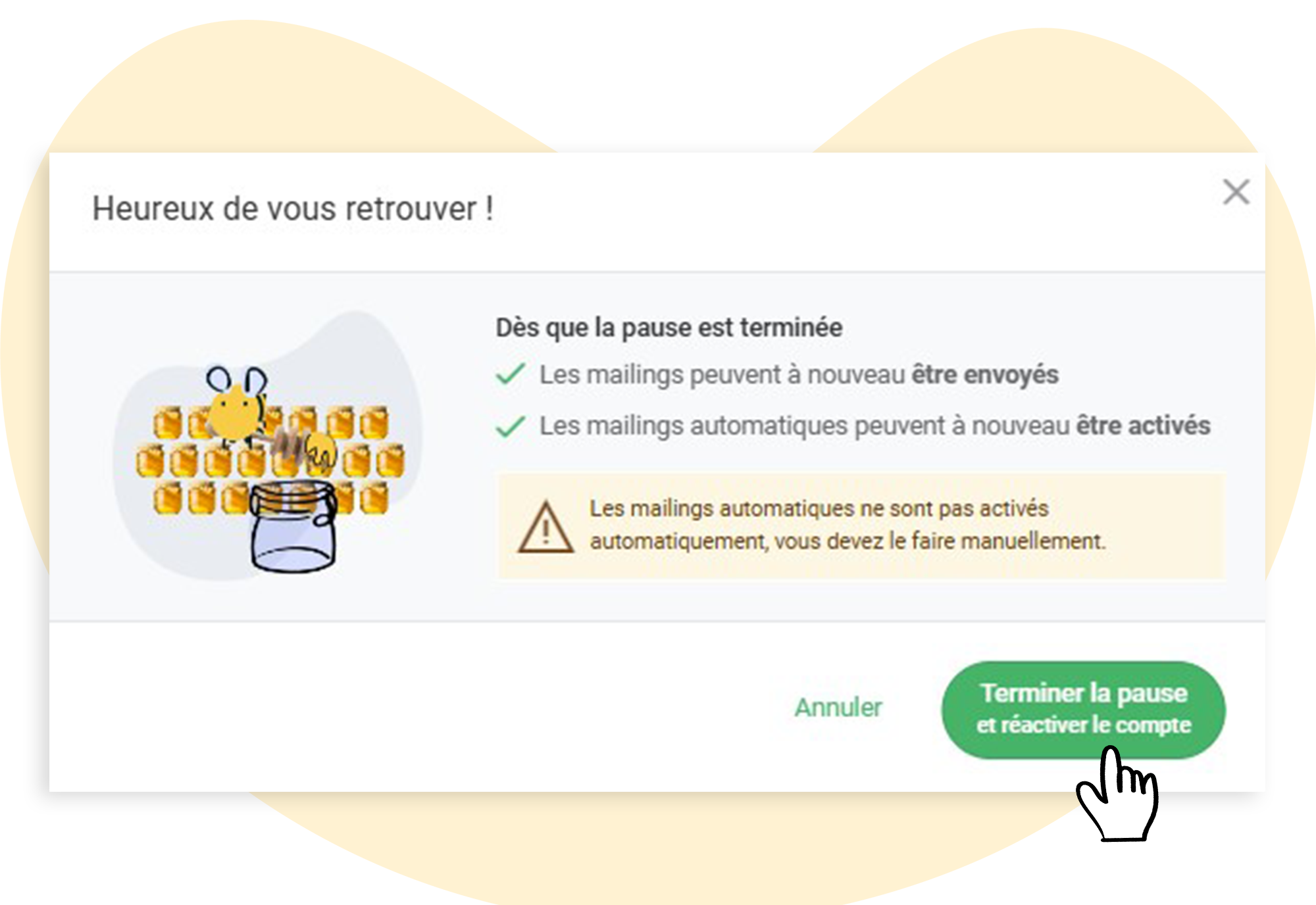 Cliquez sur le bouton de confirmation. Votre pause prendra fin immédiatement et vous pourrez reprendre l’envoi de vos newsletters.