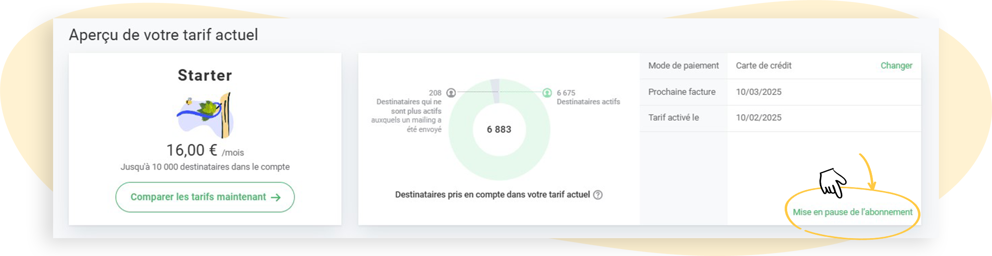 - Si vous choisissez un abonnement mensuel rapidmail, vous pouvez le mettre en pause à tout moment.