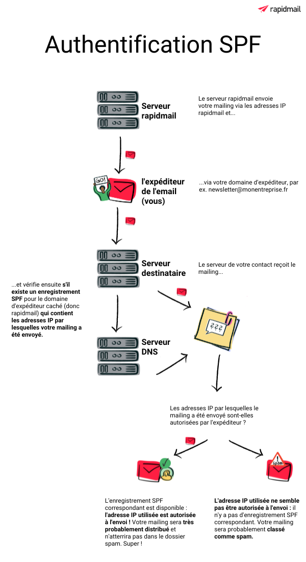 Lorsque vous utilisez la procédure SPF comme méthode d'authentification, chaque mailing envoyé fait l'objet d'une vérification de l'adresse IP avant d'être livré. Si l'adresse IP figure dans l'enregistrement SPF, l'email est délivré au destinataire. Cette validation confirme votre authenticité en tant qu'expéditeur.
