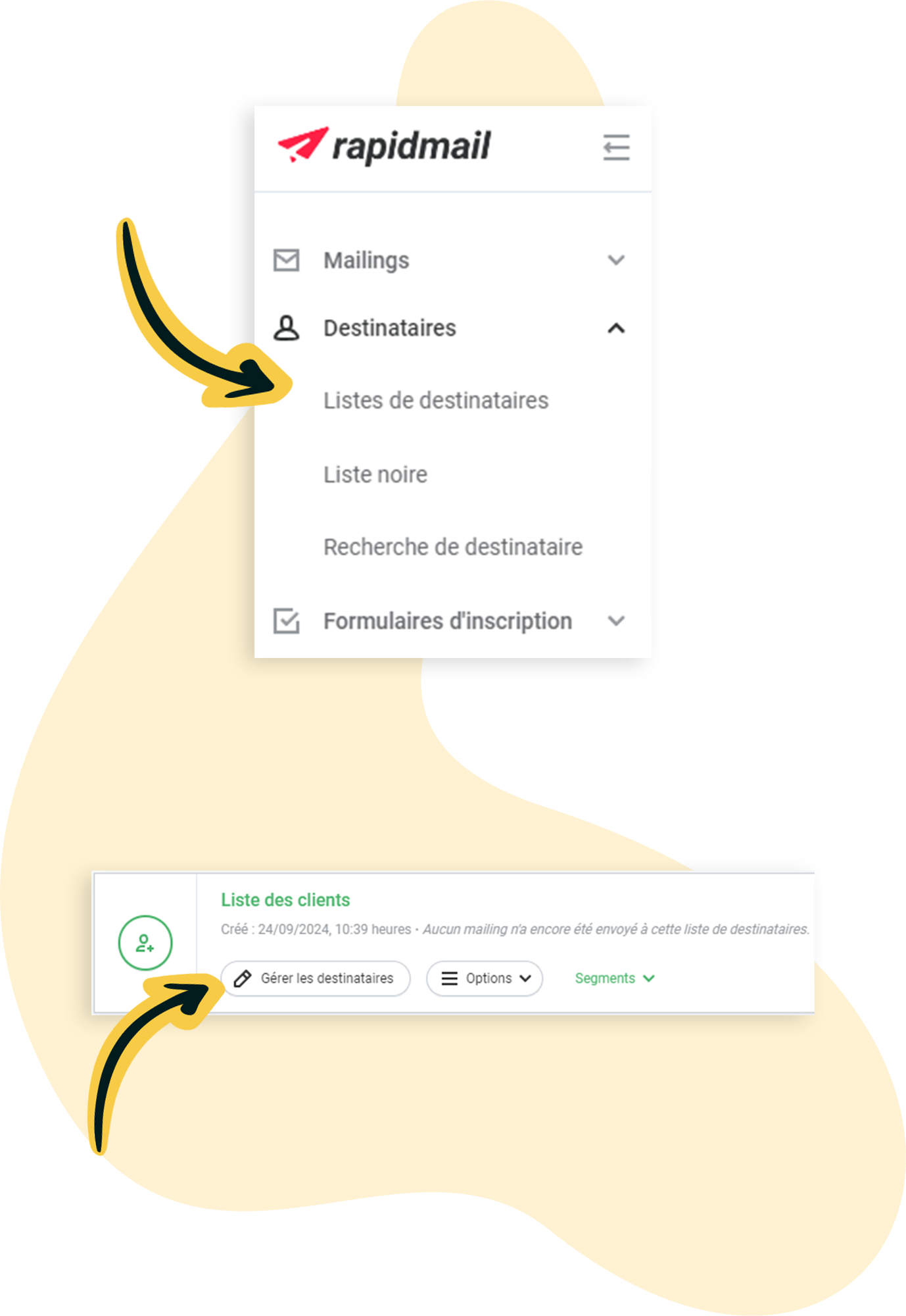 Pour supprimer le/la destinataire d'une liste conformément au RGPD, allez dans la liste de destinataires correspondante. Pour ce faire, cliquez dans votre compte à gauche sur Destinataires > Listes de destinataires et cliquez ensuite sur le bouton Gérer les destinataires dans la liste de destinataires correspondante.