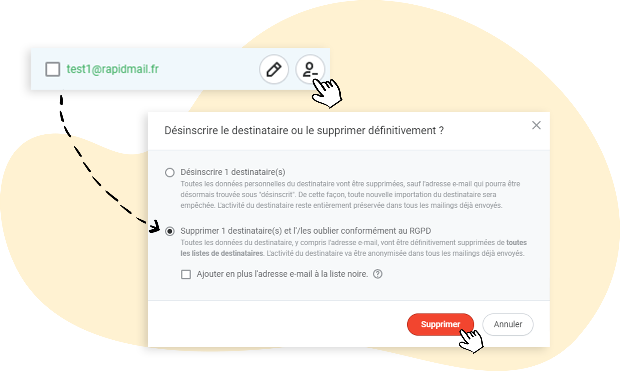 Passez avec la souris sur une adresse email, un symbole de désinscription du contact apparaît à droite. Cliquez sur cette icône : vous pourrez choisir de désinscrire le contact ou bien le supprimer conformément au RGPD.