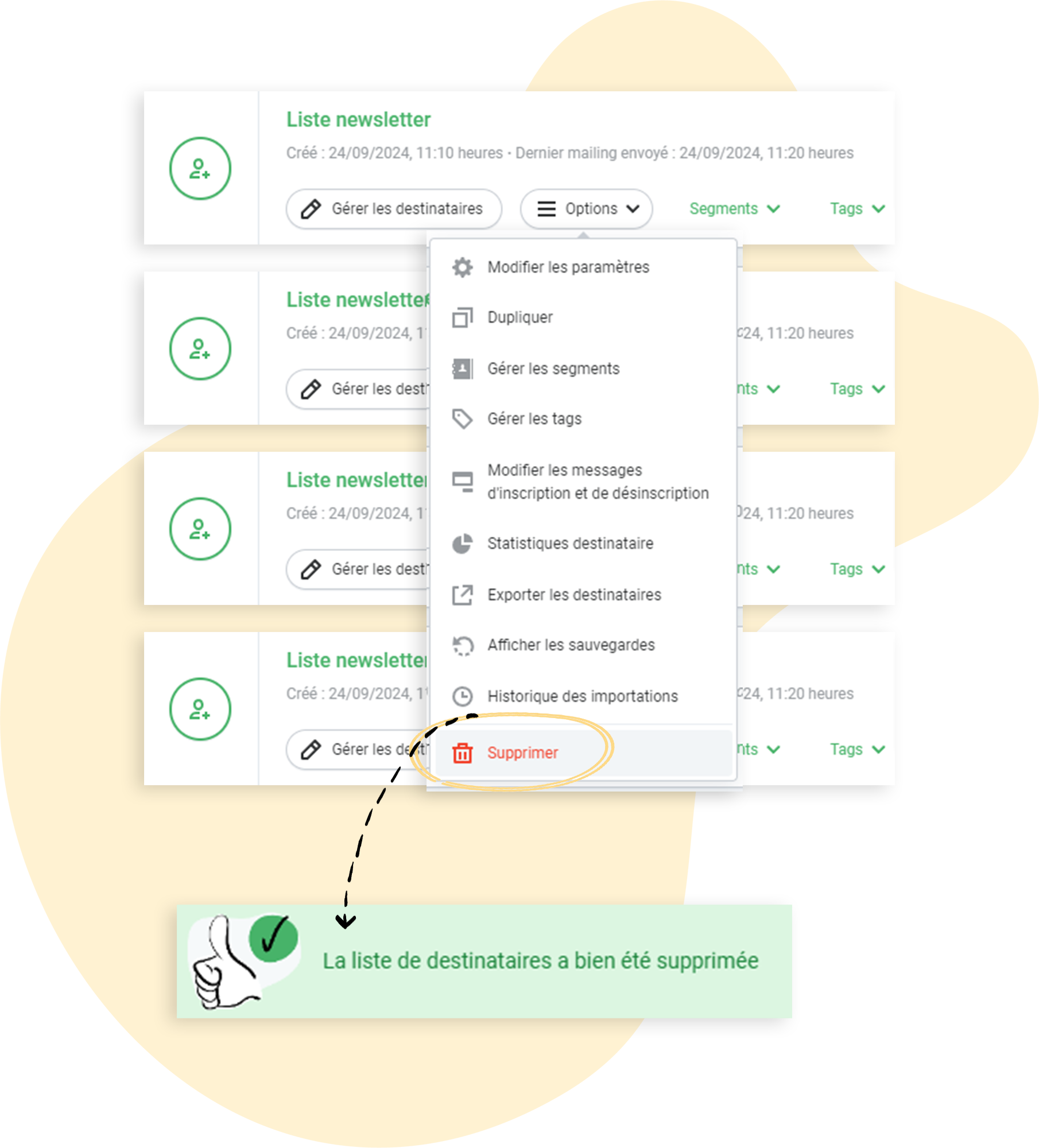 Le processus de suppression de liste est irréversible : dès que vous confirmez votre demande de suppression, votre liste sera définitivement supprimée . Si vous souhaitez sauvegarder les données du destinataire, nous vous recommandons de le faire avant de les supprimer en faisant préalablement un export et enregistrez-le localement.