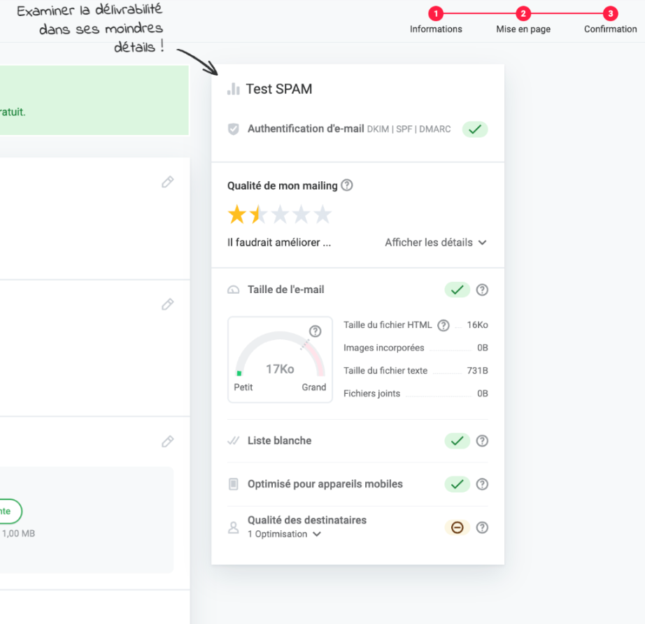 Ne laissez plus le hasard décider de la réussite de vos campagnes ! Grâce au contrôle anti-spam automatique de rapidmail, vous pouvez vérifier avant l’envoi si votre newsletter risque d’être classée comme spam. Cet outil analyse votre contenu en temps réel et vous propose des conseils d’optimisation précieux pour corriger les éventuels pièges. Résultat ? Vous envoyez vos emails l'esprit tranquille, avec la certitude qu'ils atterriront directement là où ils doivent être : dans la boîte de réception de vos abonnés !