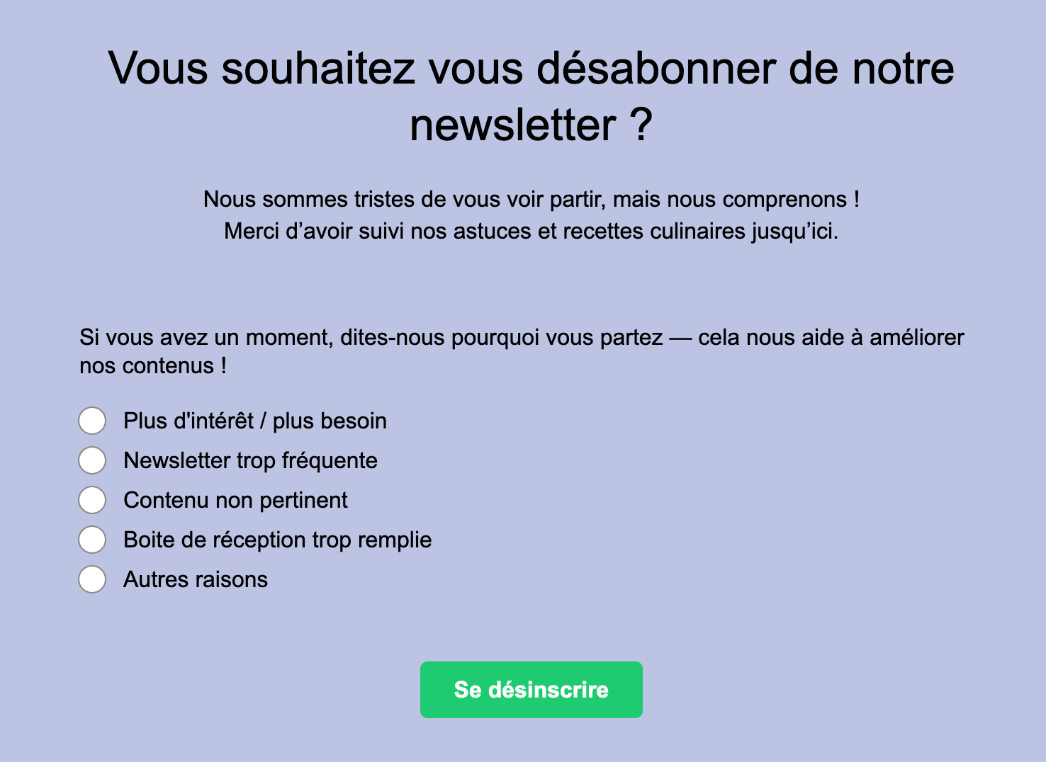 - Indiquer clairement de quelle newsletter vos abonné·e·s sont en train de se désinscrire.