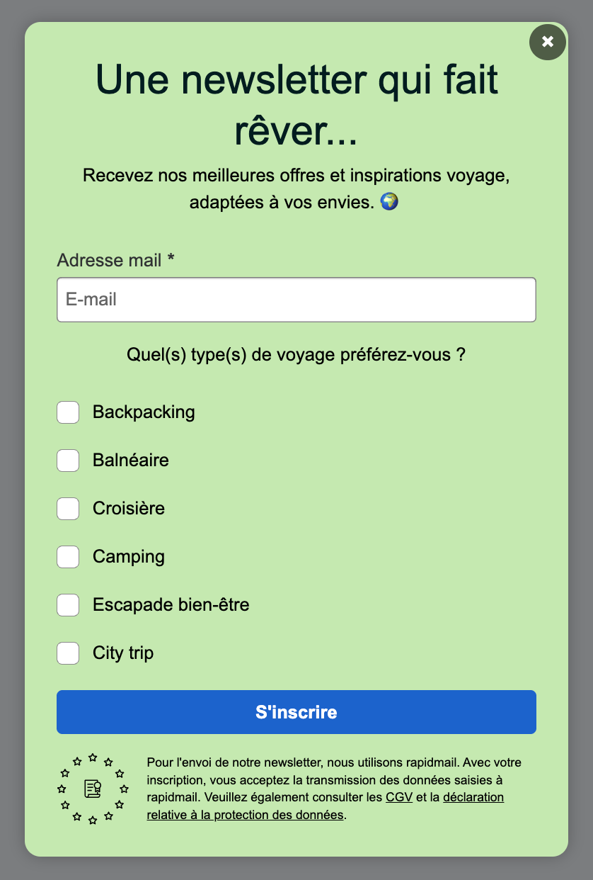 - L'exemple concret : Si vous gérez une agence de voyage, l'âge est une donnée précieuse. Un fan de backpacking de 25 ans n'a pas les mêmes attentes qu'un adepte de croisières de 65 ans. Proposer un champ "date de naissance" permet d'ajuster vos offres instantanément.