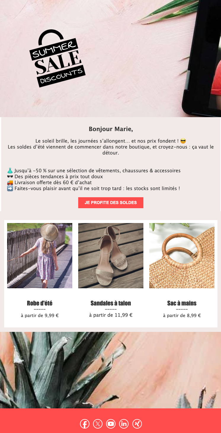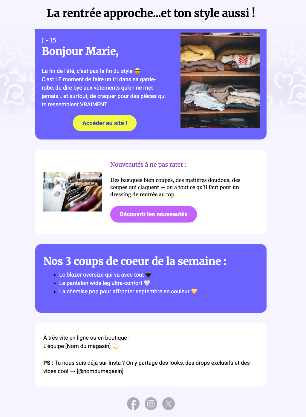 Le marketing saisonnier est un incontournable. Que ce soit pour la rentrée, Noël ou les soldes, l'idée est de créer une ambiance cohérente avec le calendrier de vos abonnés.