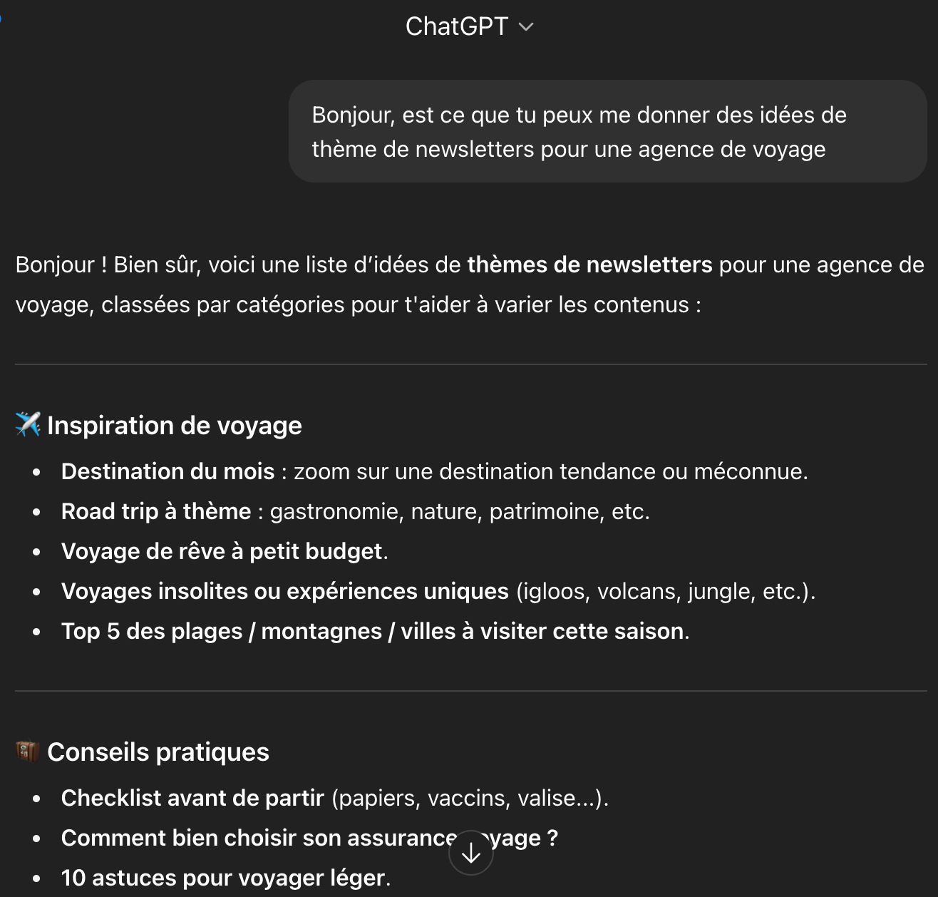 - Le brainstorming instantané : Vous manquez d'inspiration ? Demandez à des outils comme ChatGPT ou Gemini de lister 10 thématiques qui préoccupent votre audience cible.