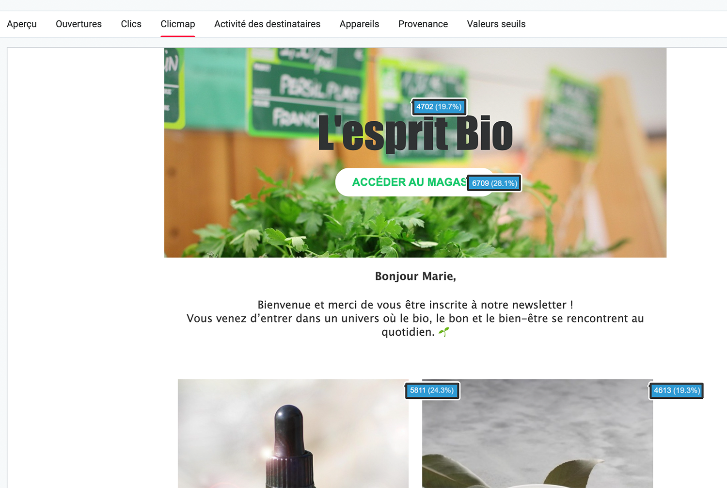 Avec rapidmail, chaque envoi génère une carte de clics (clickmap). Cet outil visuel est une mine d'or pour votre stratégie éditoriale. Elle vous permet de visualiser précisément où se porte l'intérêt :