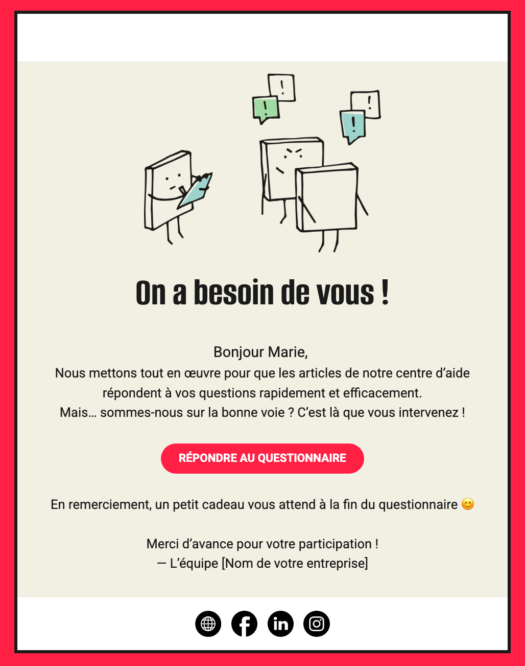 - Préparez votre audience : Dans votre newsletter, expliquez l'importance de leur avis. Utilisez un ton léger et engageant.