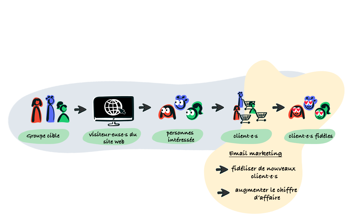 - ↩️ Fidélisation : même si vos client·es ont déjà acheté chez vous et apprécient vos produits, rien ne garantit qu’ils reviendront naturellement. Avec la multitude d’offres sur le marché, un marketing régulier est indispensable pour rester présent dans leur esprit et les transformer en client·es fidèles.