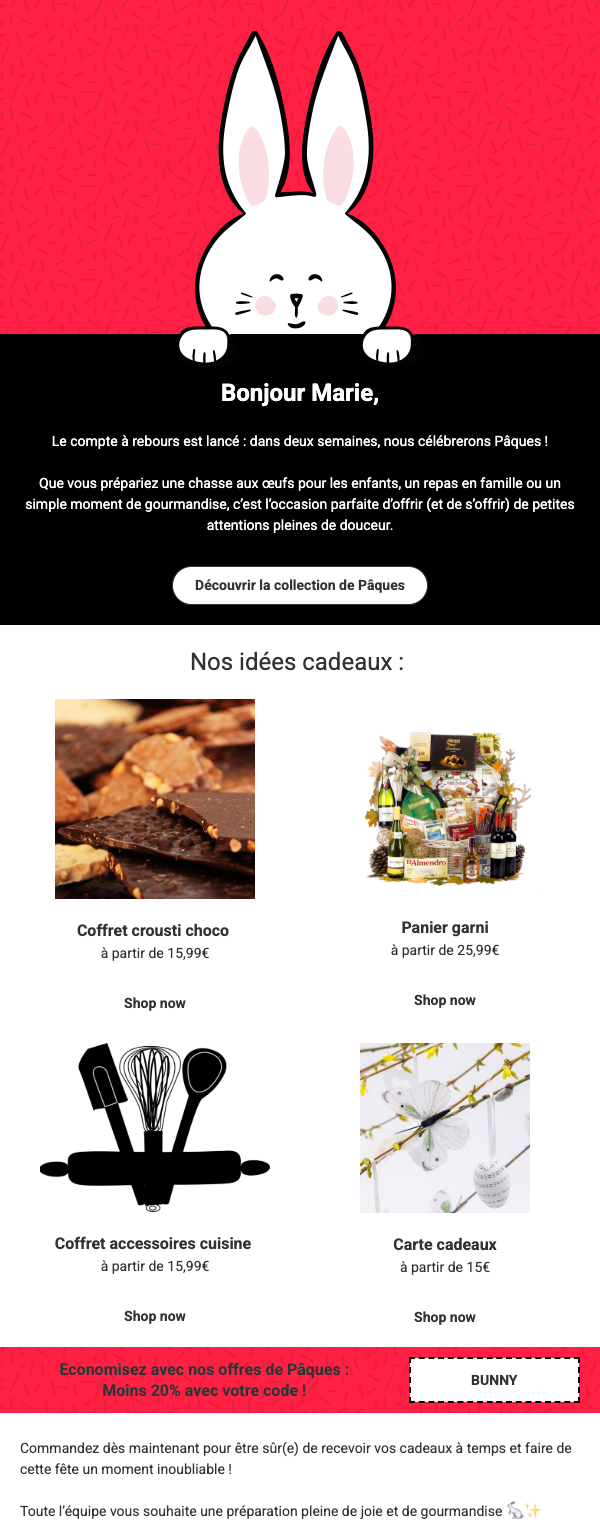 | Dans la semaine avant Pâques | 1 à 2 emails de rappel : Assurez-vous que vos contacts n’ont pas oublié votre campagne. Une newsletter attrayante permet de rappeler vos offres et, si nécessaire, de préciser la date limite pour passer commande afin que les cadeaux arrivent à temps. |