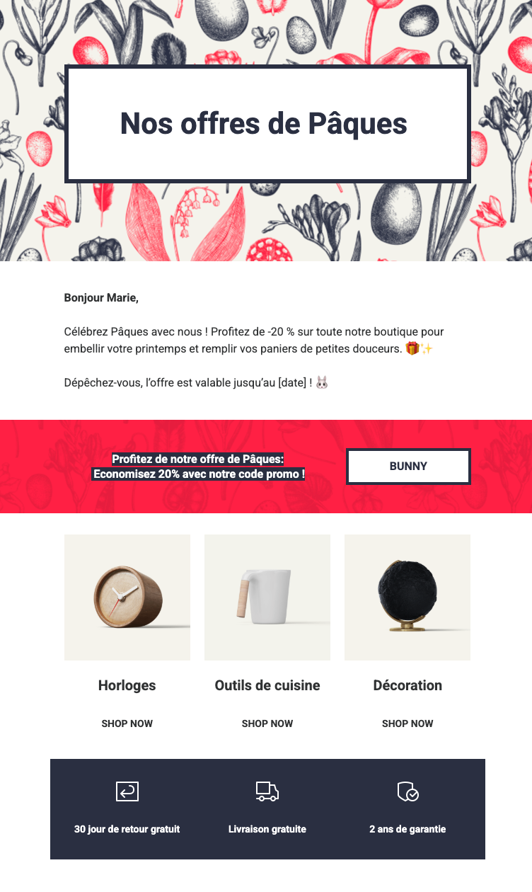 Lorsque vous préparez votre campagne marketing de Pâques, prenez le temps d’analyser votre gamme de produits. Quels articles pourraient vraiment être utiles à vos clients à cette période ? Sélectionnez les plus pertinents et mettez-les en avant dans votre newsletter. Vous pouvez par exemple proposer des packs pratiques : un kit d’outils pour accrocher la déco de Pâques dans toute la maison, ou encore des ustensiles de cuisine qui facilitent la préparation du brunch de Pâques.