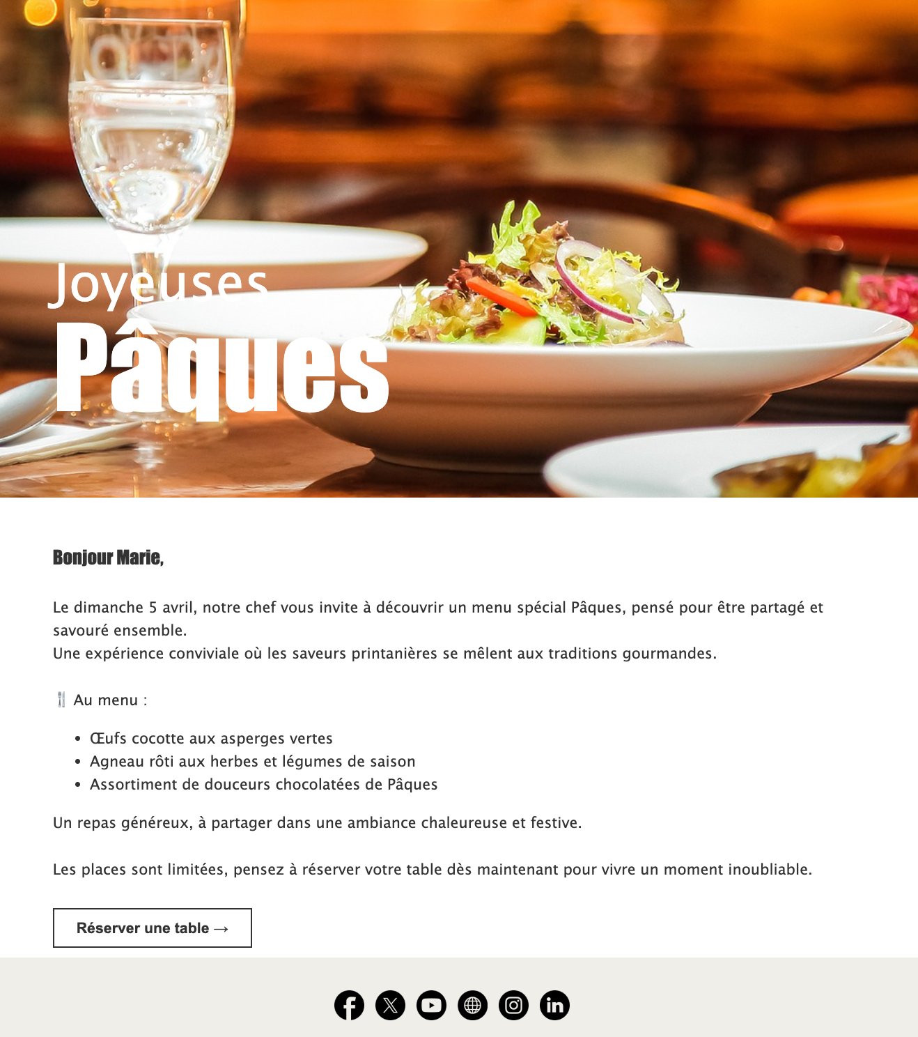 Préparez votre menu de Pâques à l’avance et mettez-le en valeur sur une belle photo. Cette image pourra ensuite servir d’illustration principale pour votre newsletter. Si vos lecteur·rice·s salivent dès l’ouverture de votre e-mail, il y a de fortes chances qu’ils ne résistent pas et réservent immédiatement une table pour le week-end de Pâques !