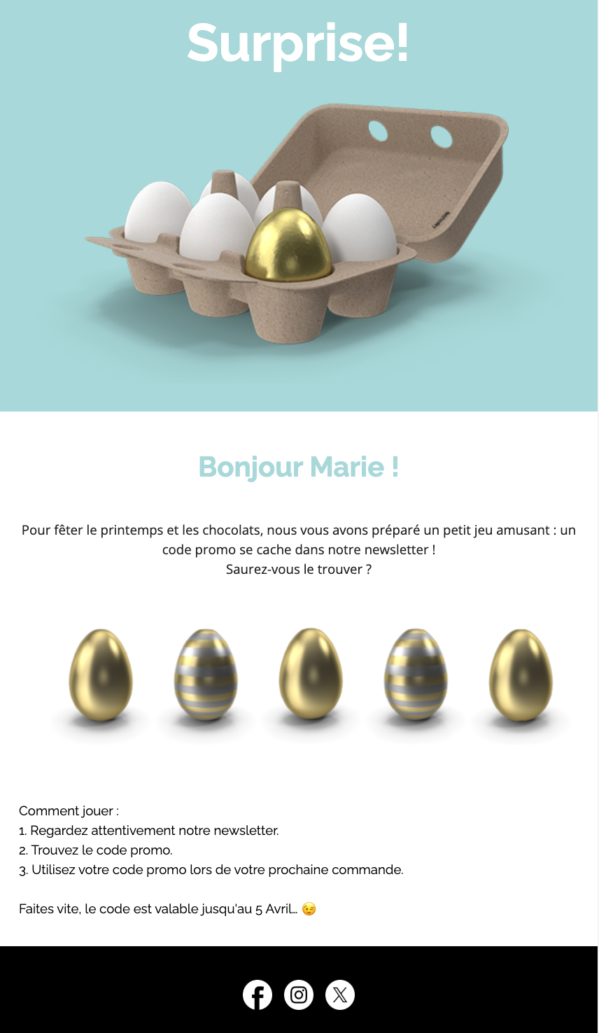 Vous cherchez d’autres idées créatives pour votre campagne de Pâques ? Pourquoi ne pas proposer une liste de jolis cadeaux disponibles dans votre boutique ? Ou organiser une chasse aux œufs digitale dans votre newsletter et sur votre site web. Comme un calendrier de l’Avent par email, cachez de petites surprises via des liens textes, des boutons d’appel à l’action ou des images cliquables, et jouez le rôle du lapin de Pâques pour faire plaisir à vos abonné·e·s 🐰.