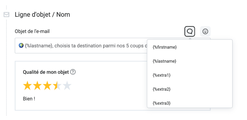 Les emojis attirent immédiatement l’attention et font office de véritables accroche-regards. Ils ajoutent une touche visuelle originale qui permet à votre objet de se démarquer dans la boîte de réception de vos destinataires. Par exemple : “ 🎬 Films & Séries – Ta liste à regarder ce mois-ci” ou “🏃 Atteins tes objectifs plus vite ! Le plan d'entraînement parfait”. Mais attention à rester sobre et pertinent (1 à 2 emojis max par objet).