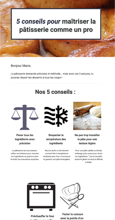 Si vous travaillez dans le secteur de la gastronomie, vous avez non seulement l’opportunité d’attirer plus de clients avec des offres spéciales, mais aussi de partager des idées de recettes créatives ou de mettre en place des semaines thématiques que vous pouvez promouvoir dans votre newsletter gastronomique.