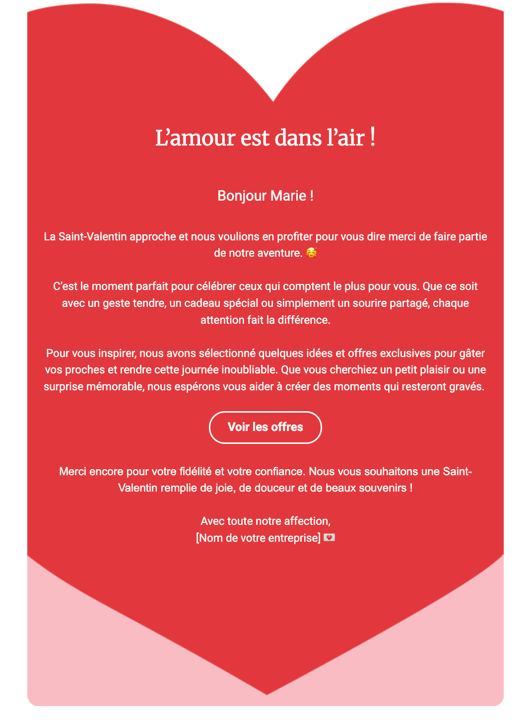 Profitez de cette date pour mettre en avant, via votre newsletter, tous vos produits qui feraient d’excellents cadeaux de Saint-Valentin, ou pour informer vos abonnés de vos offres spéciales et réductions pour les couples.