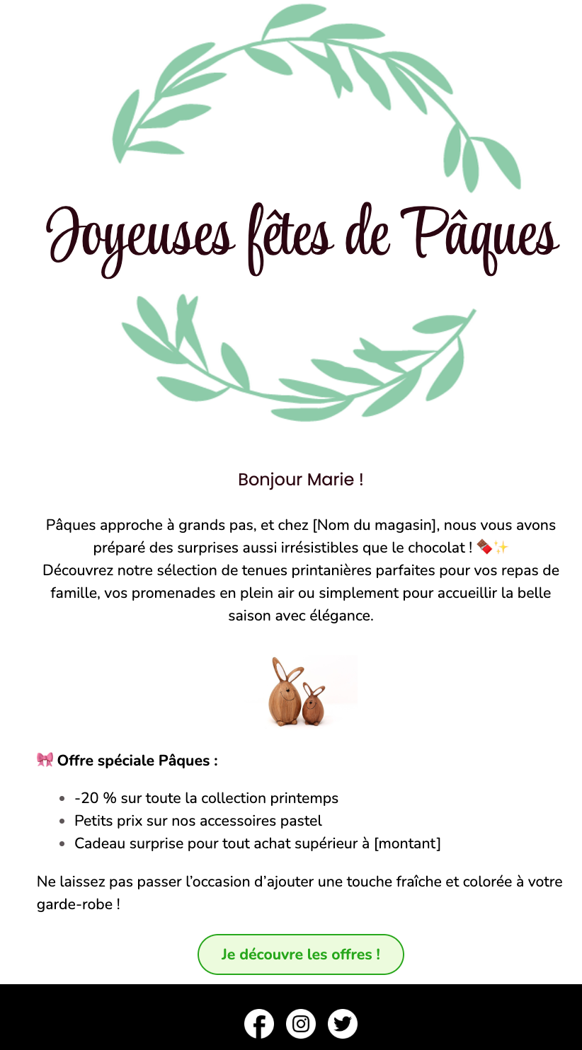 Pour remettre en avant l’esprit traditionnel de Pâques, vous pouvez également opter pour un message simple et chaleureux, accompagné de vœux de joyeuses fêtes. Ce type de newsletter renforce le lien avec vos abonnés tout en valorisant l’image de votre marque. Vous pouvez aussi y glisser des recettes originales pour le repas ou des suggestions de sorties en plein air pour le week-end ensoleillé.