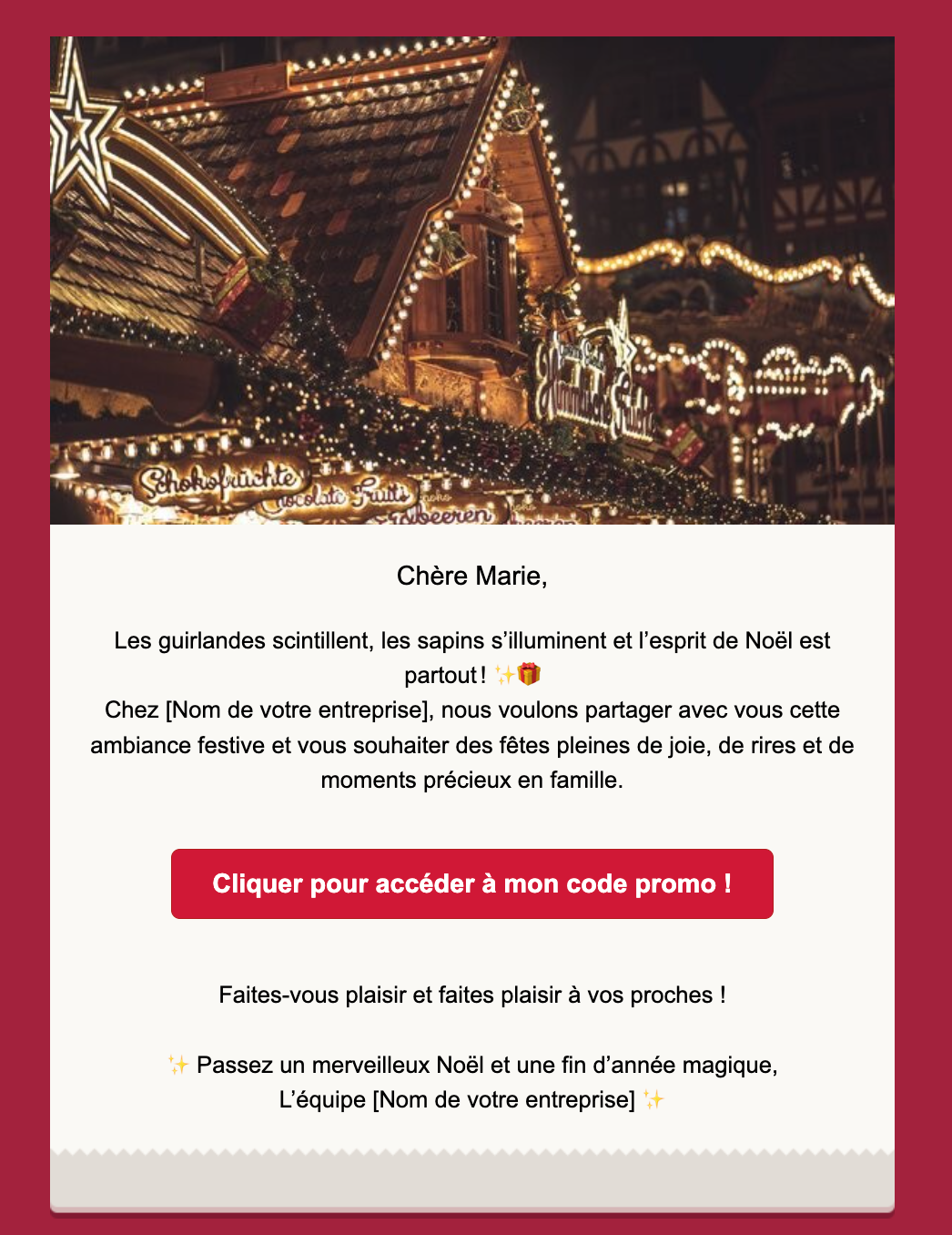 Une newsletter de Noël bien conçue renforce le lien avec vos abonnés, leur transmet de la bonne humeur et les incite à revenir vers vous tout au long de la saison festive. 💝
