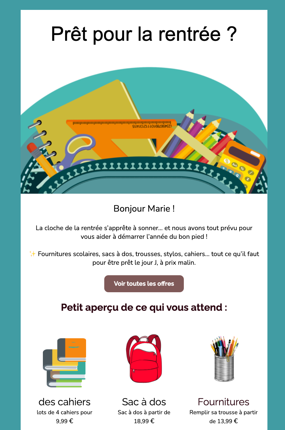 C'est la rentrée ! Cartables, trousses et fournitures doivent être prêts à temps. Les fournisseurs de papeterie, de jouets ou de douceurs peuvent profiter de cette occasion pour attirer l’attention des parents avec des offres spéciales dans leur newsletter et se démarquer de la concurrence. 🎒🍬